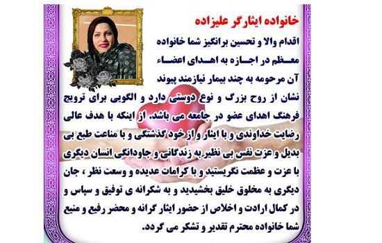 بانوی بروجردی با اهدای اعضای خود به بیماران جان دوباره بخشید